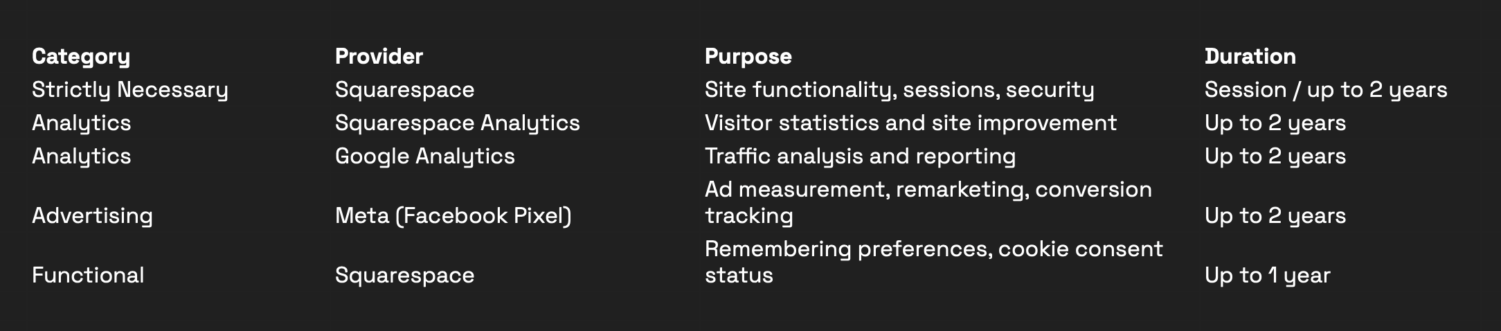 These cookies are essential for the website to function and cannot be switched off. They include cookies that enable core features such as page navigation, access to secure areas, and shopping cart functionality. Our website is hosted on Squarespace, which sets certain necessary cookies to deliver the site reliably.